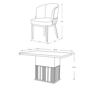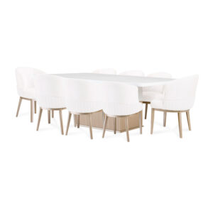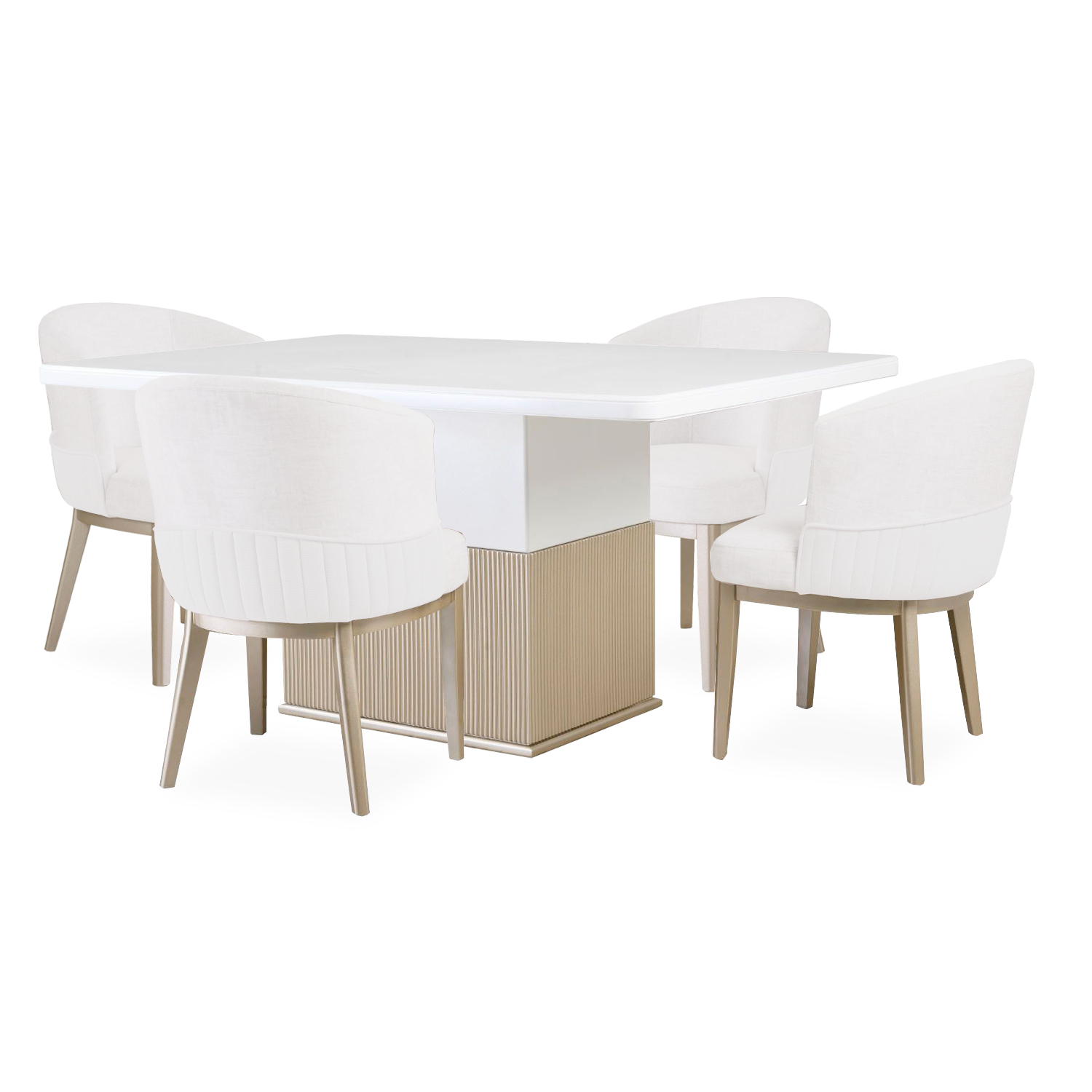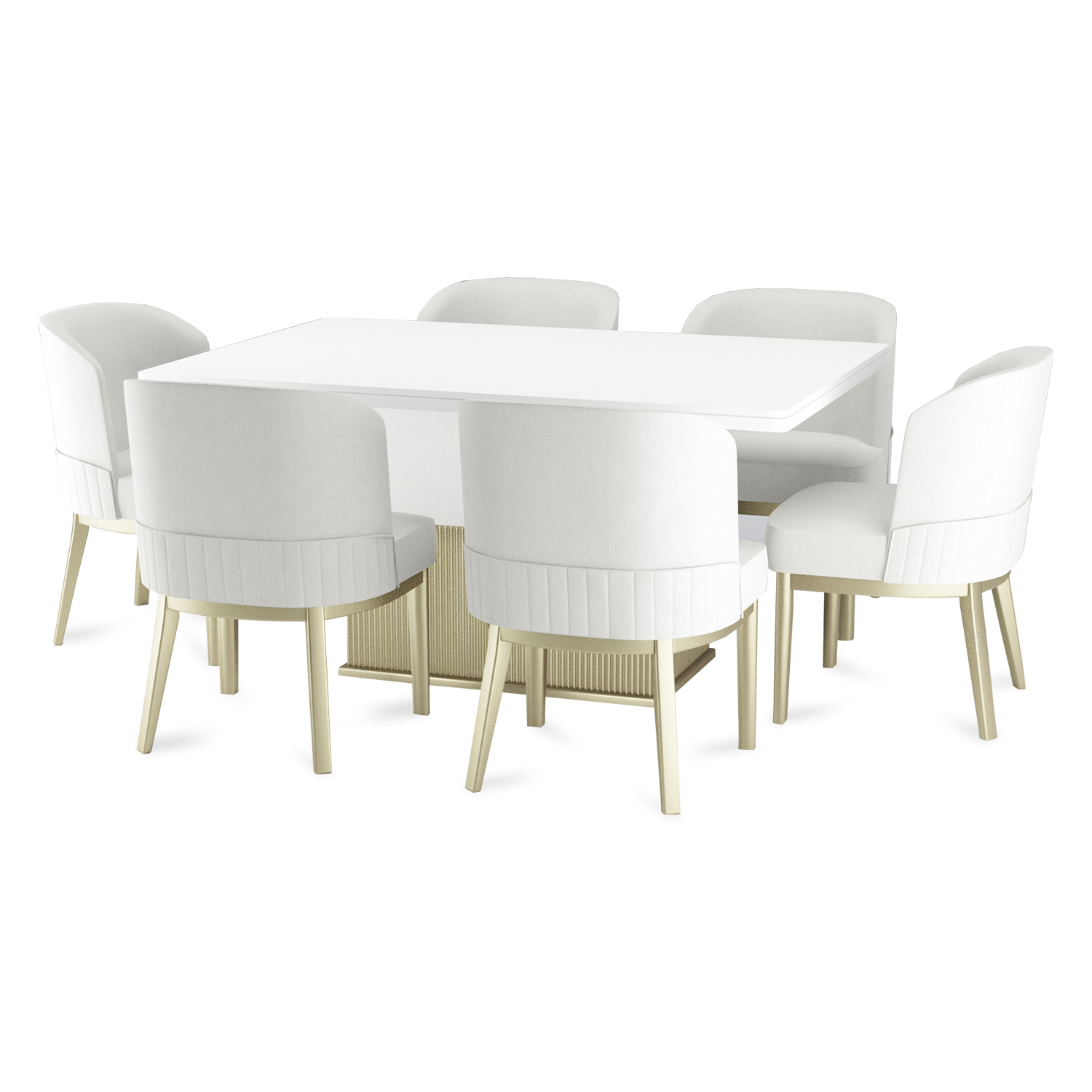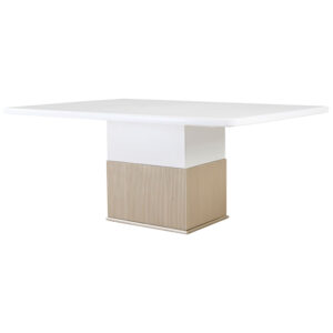 El detalle central de la base de la mesa, con textura acanalada en tono natural, añade un toque orgánico y distintivo, conectando el diseño con materiales nobles y luminosos. Ideal para espacios que buscan transmitir armonía, pureza y sofisticación moderna, el comedor Aura Moderna convierte cada encuentro en una experiencia elegante y acogedora.