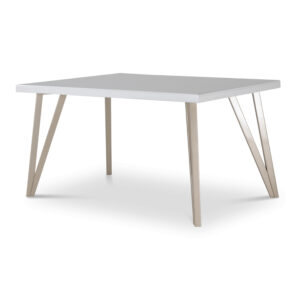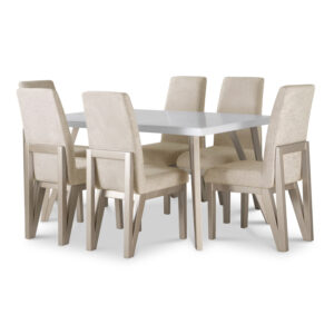 El comedor Dublin destaca por su diseño contemporáneo y elegante. Su mesa de líneas limpias con cubierta brillante se combina con sillas tapizadas en tonos neutros y estructura en madera roble con acabado color champagne, que aporta un brillo sutil y sofisticado. Ideal para quienes buscan un ambiente moderno con un toque glam y acogedor.